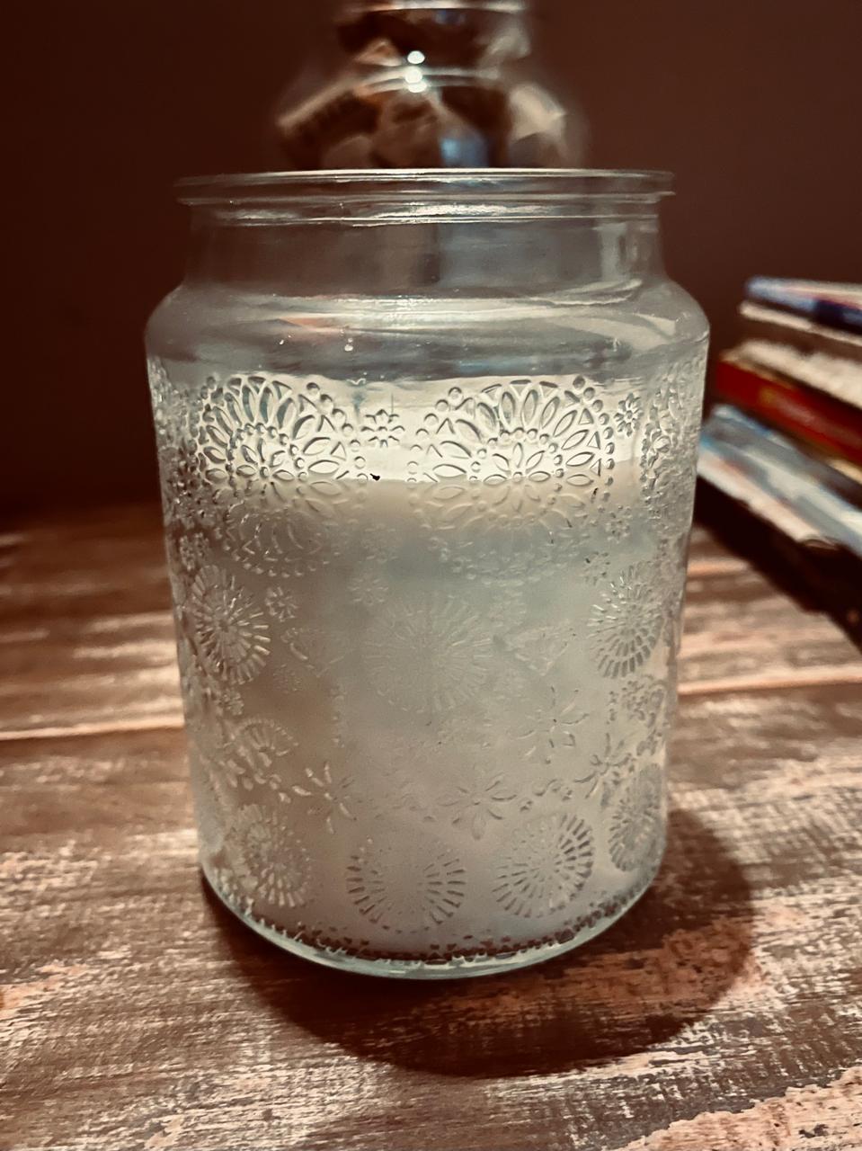 Frasco em vidro transparente, com capacidade de 700ml e desenhos em relevo.